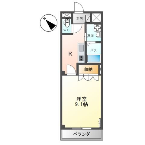 K 3.3帖 1室/洋室 9.1帖 1室 - 向き